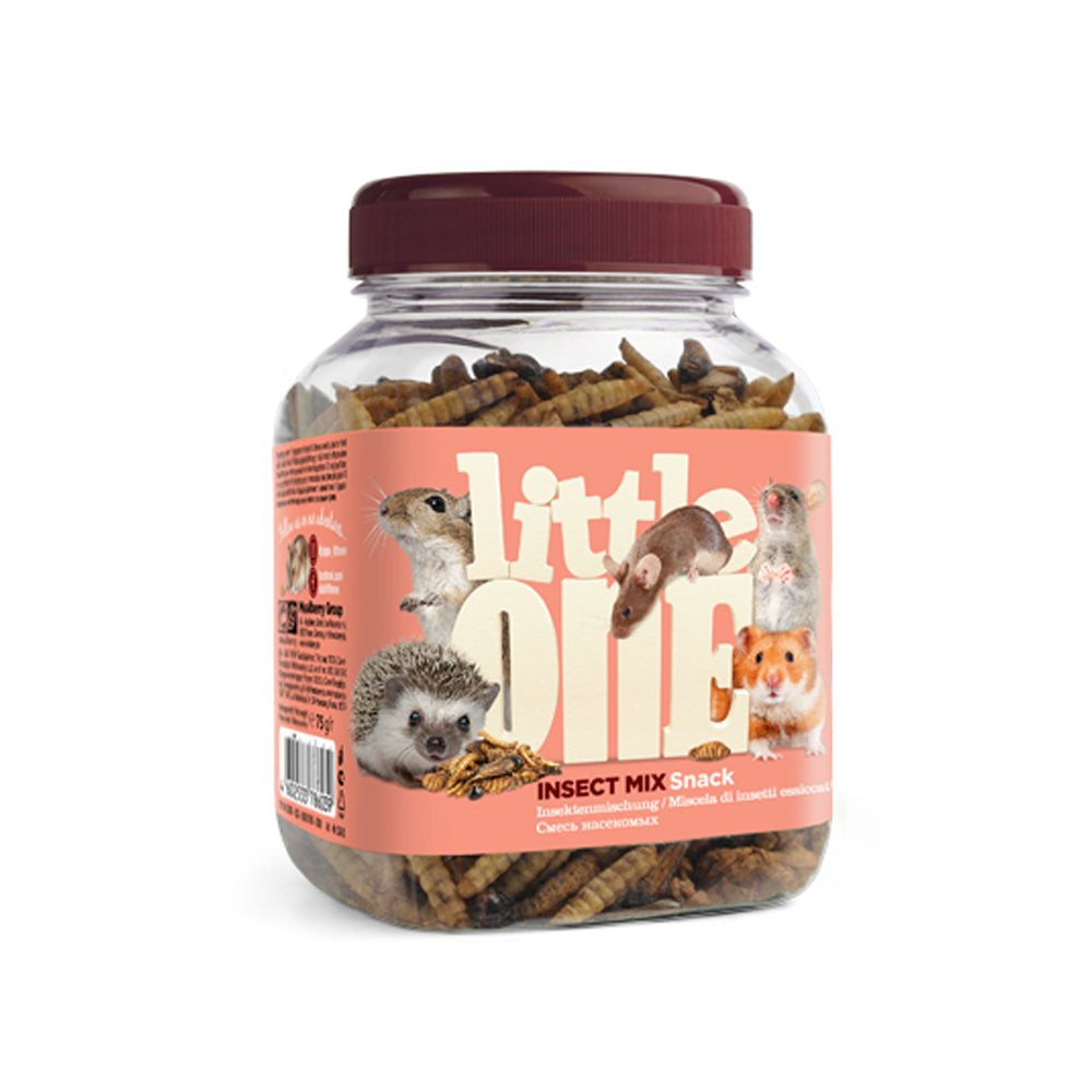 Insect mix is a delicious and nutritious complementary feed for omnivorous rodents and besides a valuable source of macro- & micronutrients. The mix is perfectly balanced and includes dried silkworm pupae, black soldier fly pupae, mealworms and crickets. Due to the included insects this snack is a great source of animal protein needed in the diet of omnivorous rodents and contains essential fatty acids, which beneficially affect the pet’s skin and coat condition. Besides, the Insect mix enriches the pet’s diet with calcium, phosphorus and magnesium, needed for healthy teeth and bones, and by containing chitin it can positively affect the digestive process.